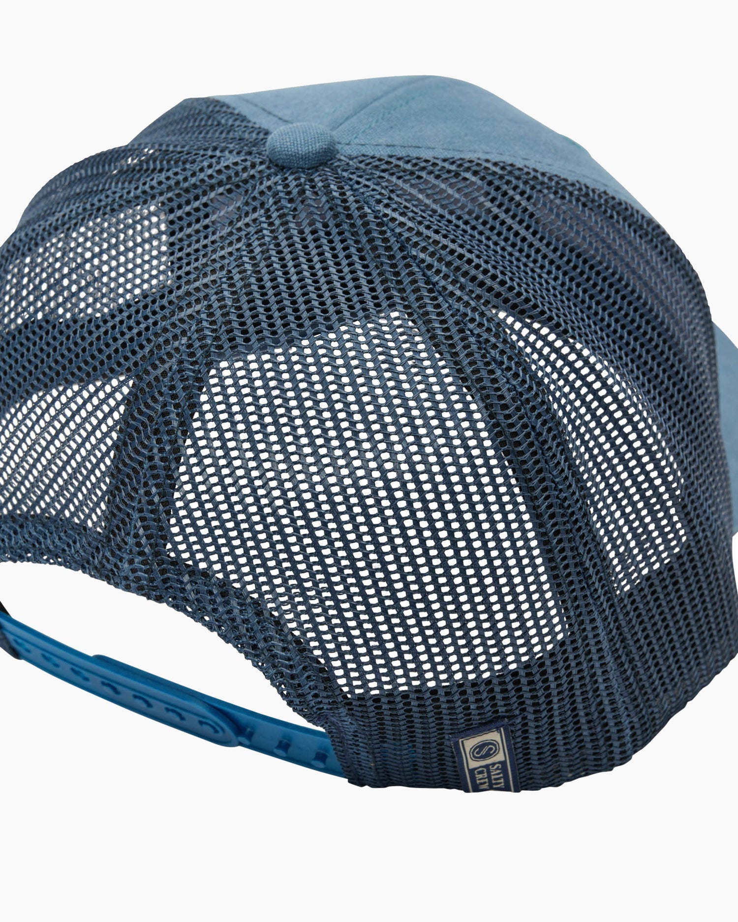 The Skewed Retro Trucker Cap in Pilot Blue is a structured 6-panel, mid-crown height trucker cap. Made from cotton canvas and 100% polyester mesh, it features a woven damask label at the front, a moisture-wicking sweatband, and a plastic snapback closure at the back.