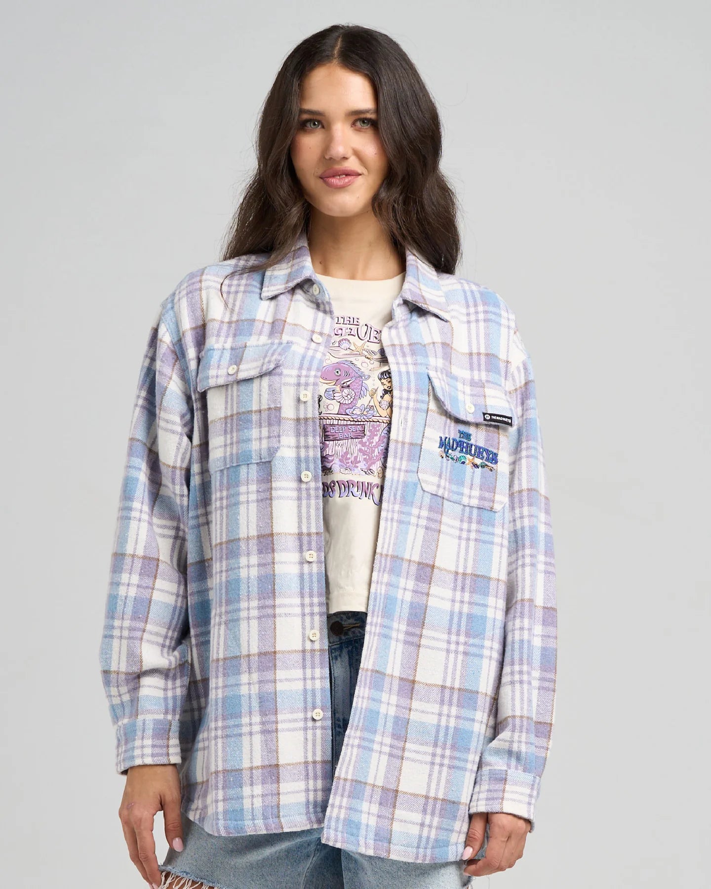 Layer up with this soft lavender shacket, featuring a classic check print and a detailed embroidered pocket for that extra touch of style. Casual yet chic, it’s perfect for breezy days or cool nights by the water. Whether you’re out for a stroll or kicking back with mates, this shacket brings a fresh, laid-back vibe with a splash of mermaid magic.